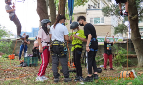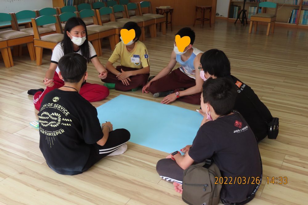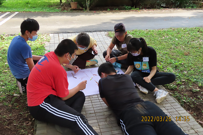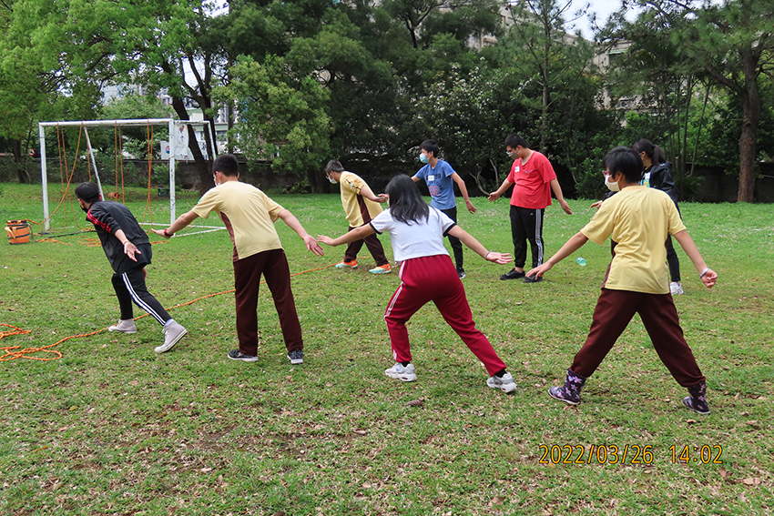 到了室外場地明謙哥哥先讓大家玩一個小遊戲,遊戲規則是當隊友碰到自已手再去碰下一位隊友的手,第一次玩這個遊戲秒數來到6秒多,經過了幾次的比賽後,明謙哥哥叫大家集合並說到:「剛剛我並沒有說這是比賽,但分成了兩組你們就不自覺的去比較,我們應該要一起互相幫忙怎麼樣可以讓秒數更快」,這時大家才領悟到想要成功必須要大家一起努力向前邁進,在大家精準嚴密的策略下秒數竟然只有2秒,大家對這次的秒數簡直就是不可置信,沒想到團隊合作可以讓秒數前進那麼多,每個人的臉上不自覺的露出一絲笑意。