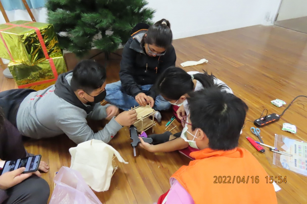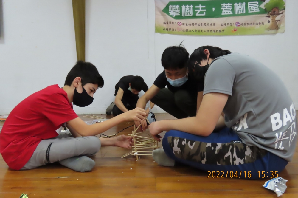 活動一開始明謙哥哥播放了一部五分鐘的影片,介紹了幾種樹屋的蓋法,明謙哥哥拿出了許多不同的工具要大家做一個樹屋的小模型,並將大家分成了兩組,擅長立體空間概念的小豬就像一個團隊偉大的領導人員代領著大家往更好的方向前行,平常不發一語的堯沒想到也是一位隱藏版的設計師,就在樹屋模型即將完成時,堯突然在樹屋上加了一個雷達,這讓溫馨可愛的小樹屋模型多了一種天馬行空的幻想。
