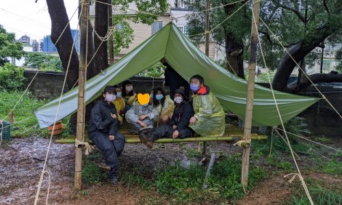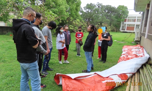 明謙哥哥叫大家集合圍成一個圈,教了許多複雜的繩結,並讓大家做練習,調皮搗蛋的J.D把麻繩卷成一團放在了自已的頭上,這樣的動作逗笑了不少的成員。設計圖畫過了,模型也了做,當然要換到重頭戲〝蓋樹屋〞明謙哥哥介紹了蓋樹屋所需要的竹子,介紹了多種工具和使用方式,並分配了工作,每一個隊員無論在什麼時後都是不可或缺的角色,此時的男生們都化身成大力士一人搬起整根竹子,小豬則像一位設計師 精準的測量著竹子的長度,堯負責將已經量好尺寸的竹子做切割,毛毛姐姐則在旁邊負責協助的工作。切割好竹子以後,首先要來做樹屋的外框,這時候剛剛學得繩結就能配上用場啦!各個隊員同心協力的將不成形狀的竹子,做到逐漸有樹屋的樣子。
